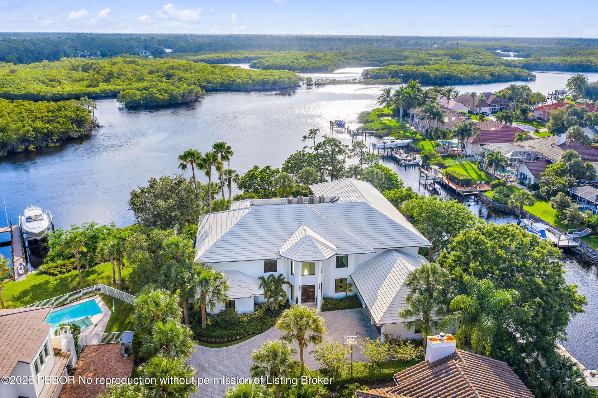 Fantastic Waterfront Home! Spacious floor plan with incredible wide water views from nearly every room. Gorgeous custom chefs kitchen with high-end appliances, two master suites and grand living areas great for entertaining. Outdoor living at its best with built in summer kitchen, pool and spa. Private dock with boat lift and plenty of room for all your smaller water toys. Easy access to the ocean!